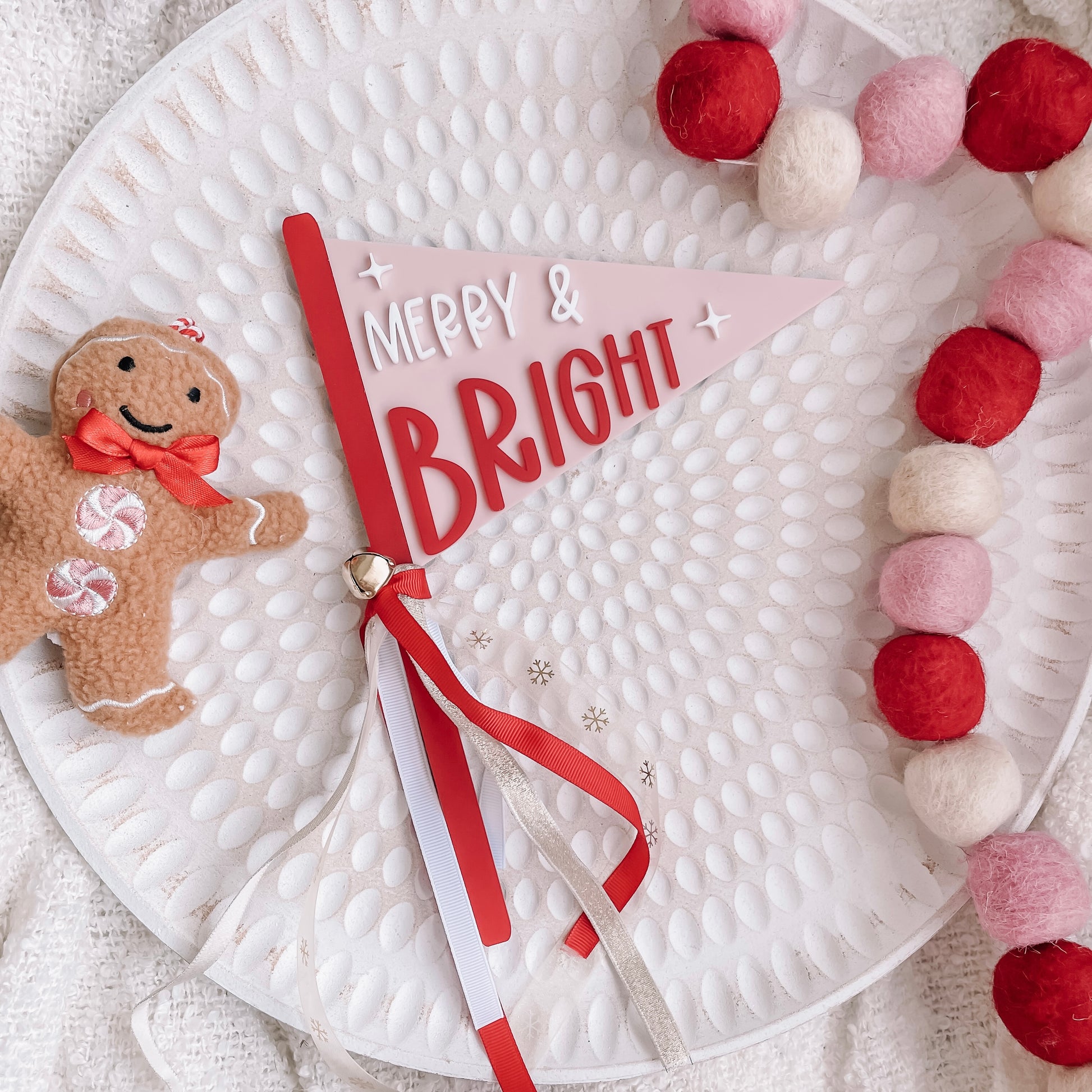 Handcrafted with a sturdy wooden backing and a playful pink and red acrylic front, this festive flag is finished with layered details for a bold, modern look. The corner is adorned with flowing ribbons in red, white, and gold plus a tiny gold bell for that extra sparkle.