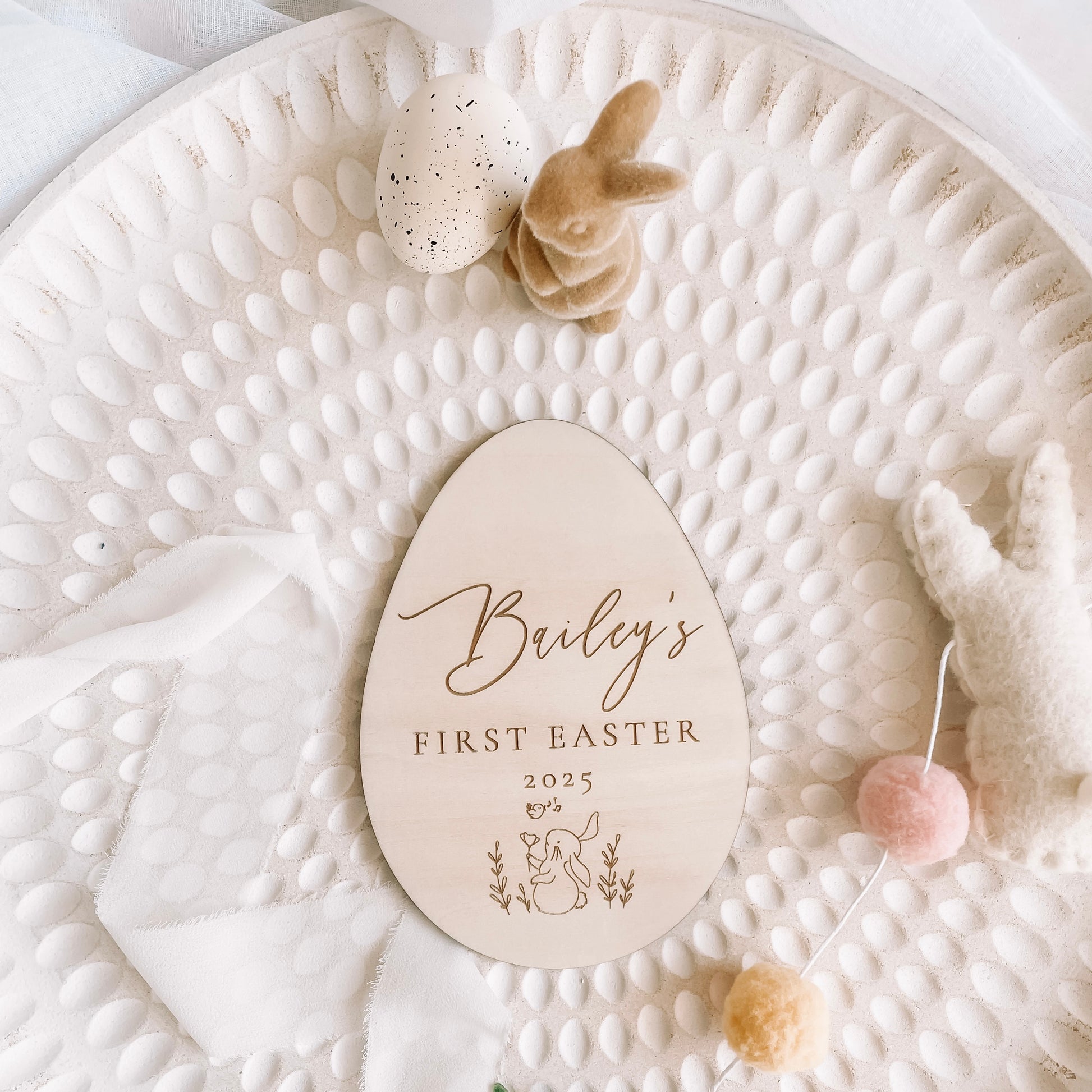 Customisable with your child’s name, this plaque adds a personal touch to this special milestone. Whether you use it as a photo prop to capture precious memories or display it as a thoughtful Easter decoration, it’s the perfect way to mark your baby’s first Easter celebration.