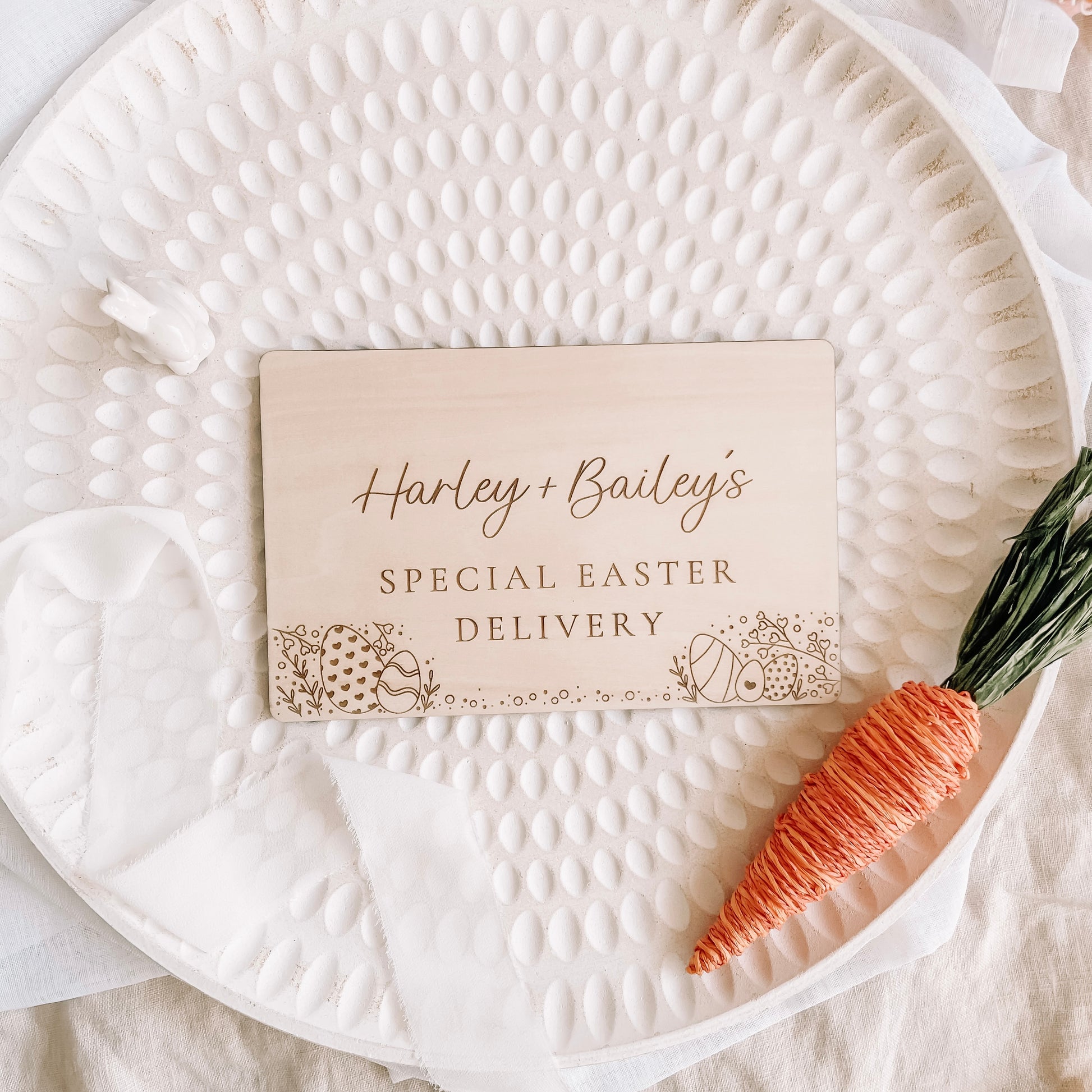 Make this Easter extra special with our beautifully crafted, personalised wooden plaque, designed to bring joy and create lasting memories for your little ones. Perfectly sized to adorn your child’s Easter box or crate, this plaque features your child’s name and can be customised with "Easter Box" or "Special Easter Delivery" – adding a personal touch to their holiday celebrations.